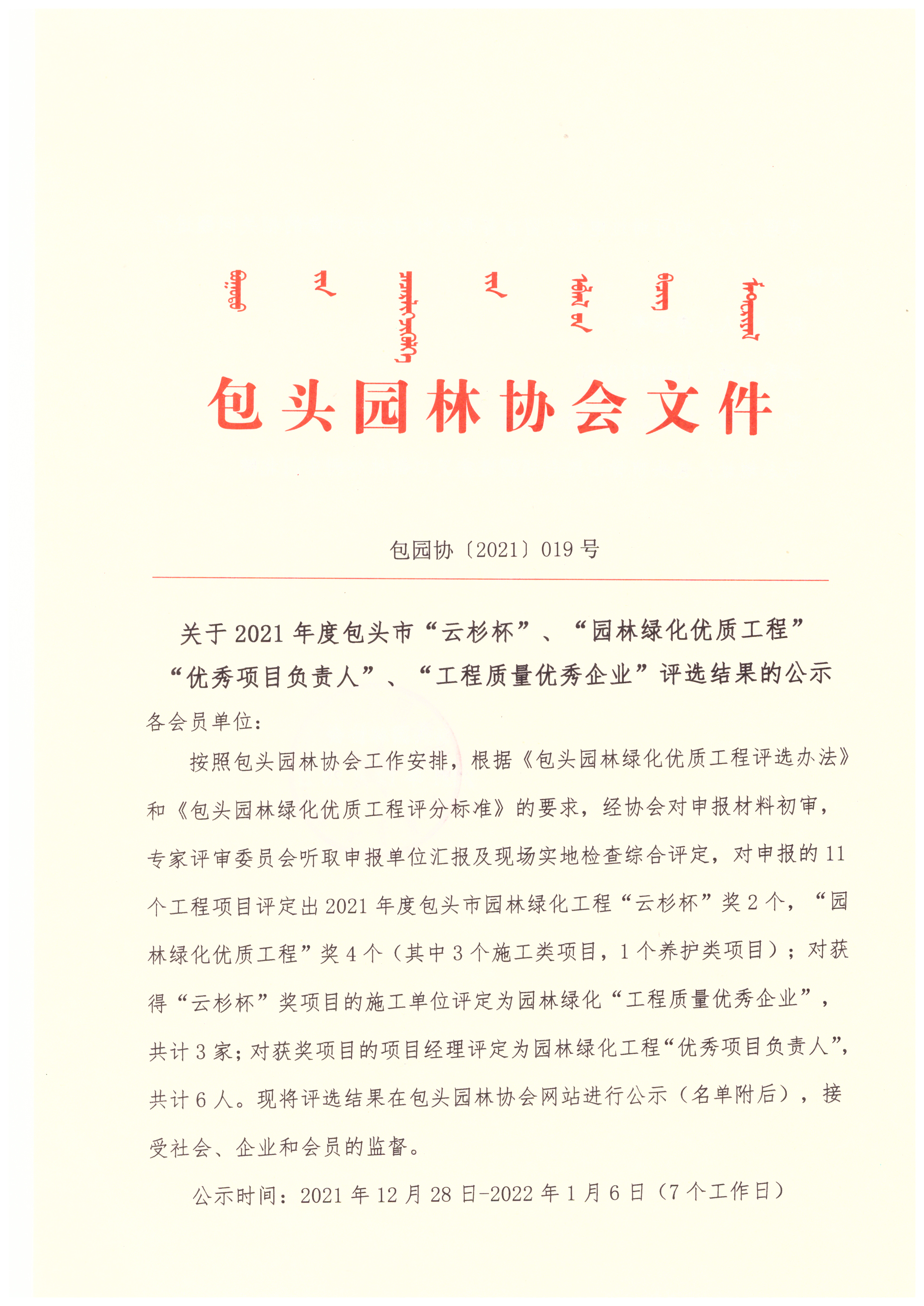 关于2021年度包头市“云杉杯”“园林绿化优质工程”“优秀项目负责人”工程质量优秀企业“评选结果的