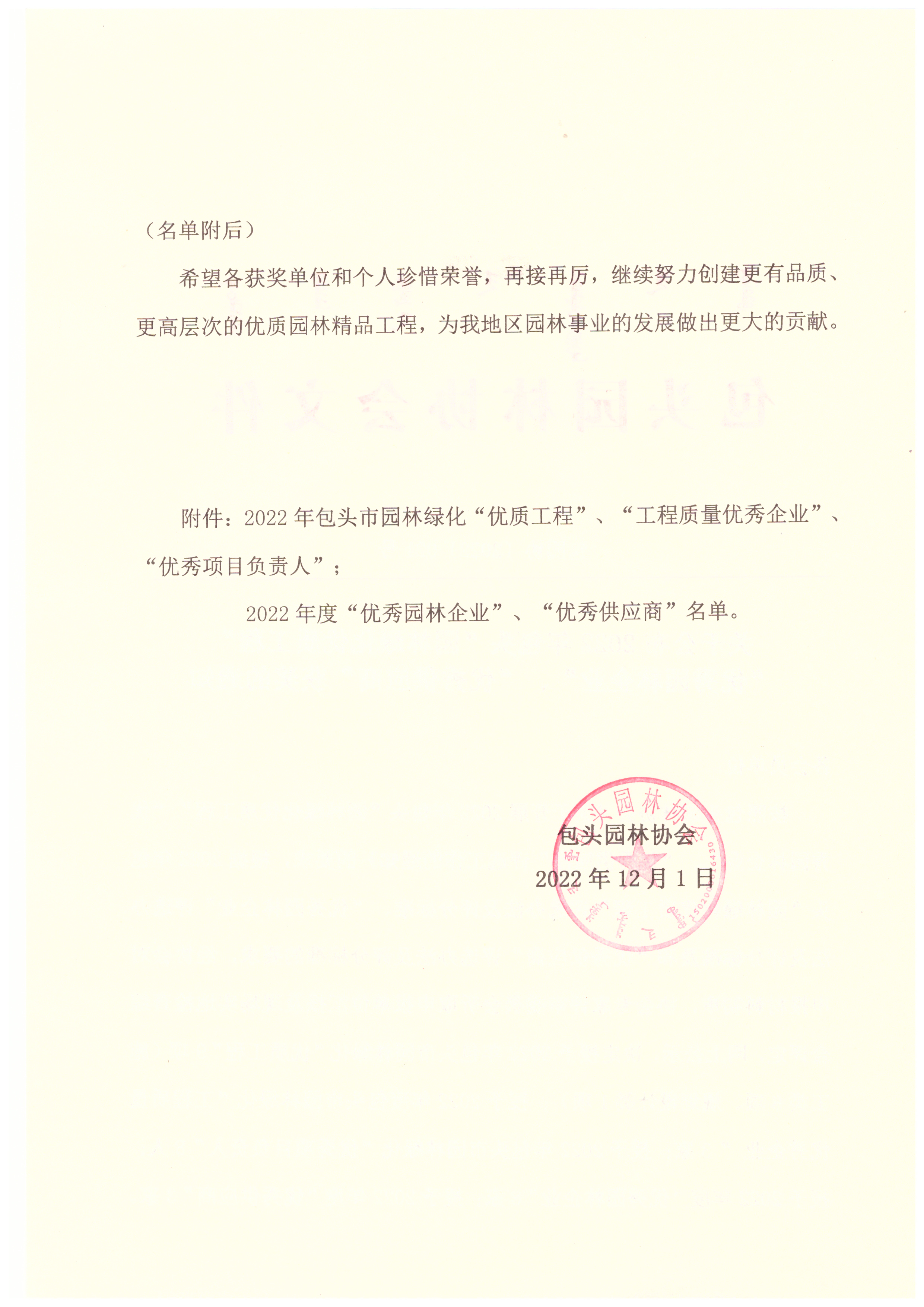 附件:2022年包头园林绿化优质工程(工程质量优秀企业、优秀项目负责人)、