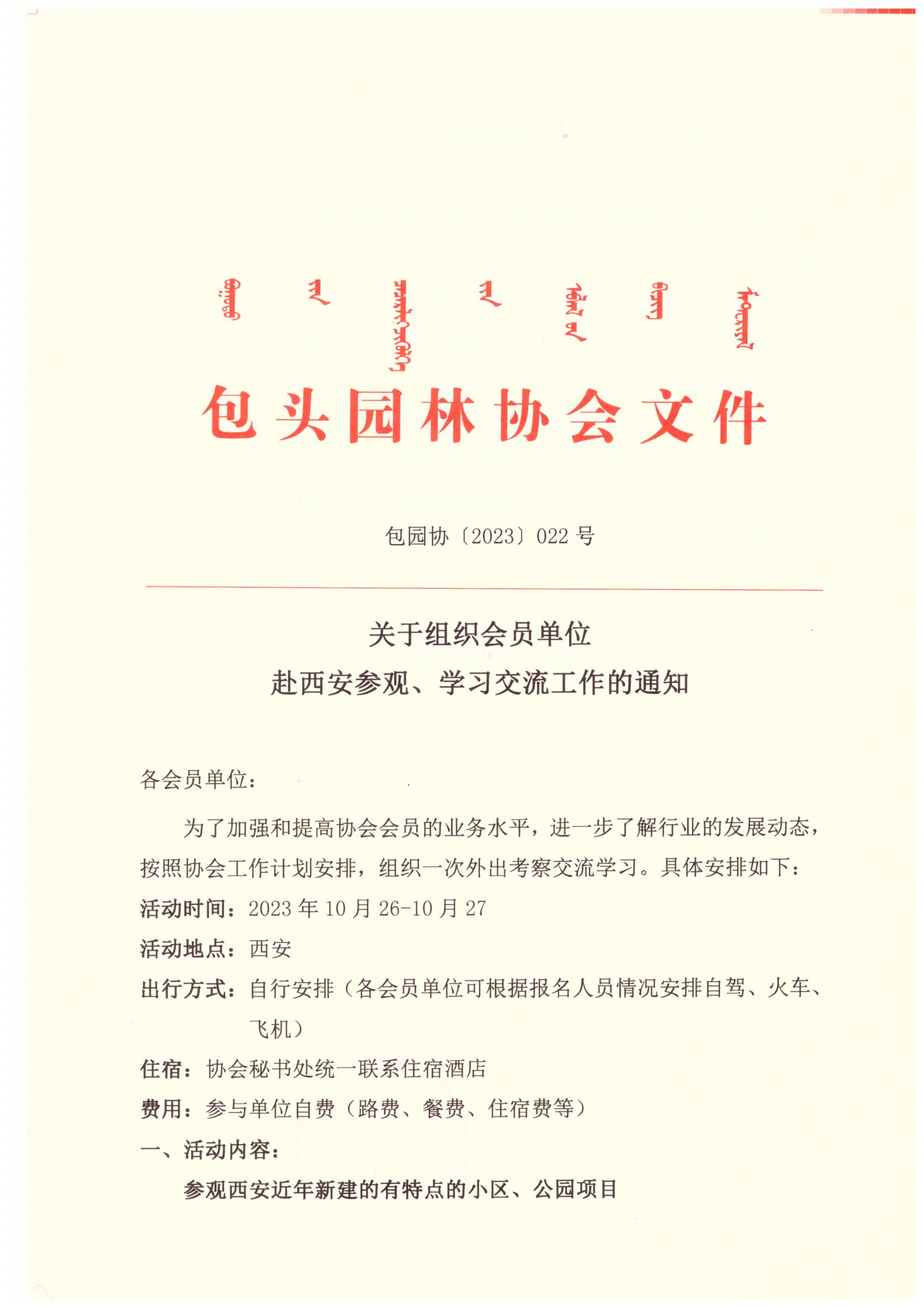 下一篇: 关于包头园林协会组织会员单位 赴西安参观、学习交流工作的函包园协〔2023〕021号