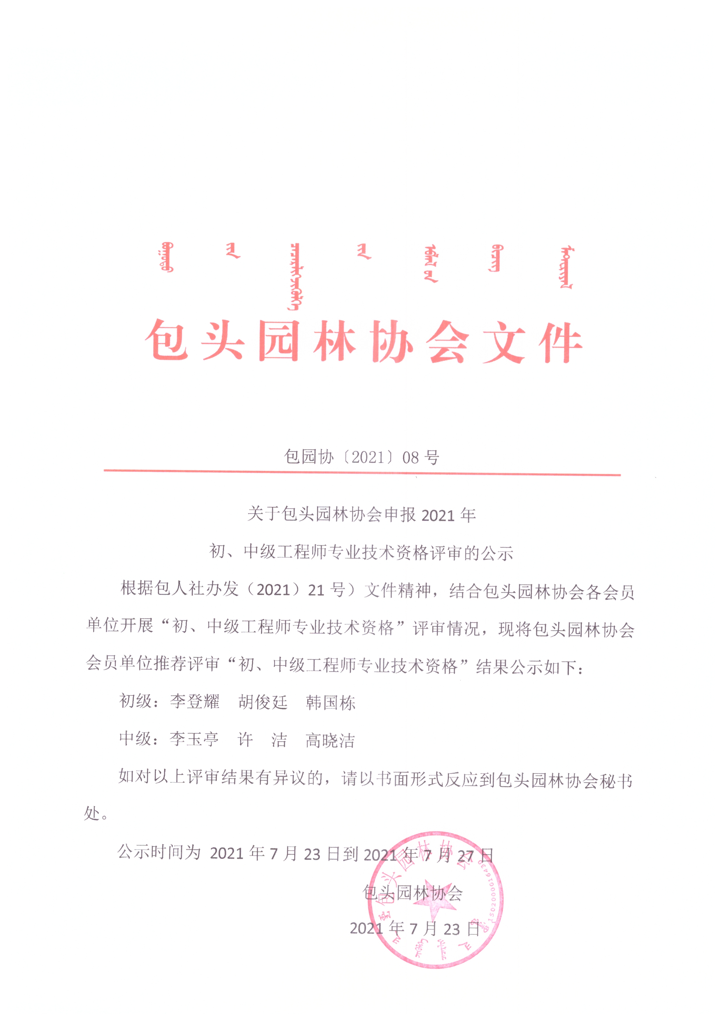 关于包头园林协会申报2021年 初、中级工程师专业技术资格评审的公示